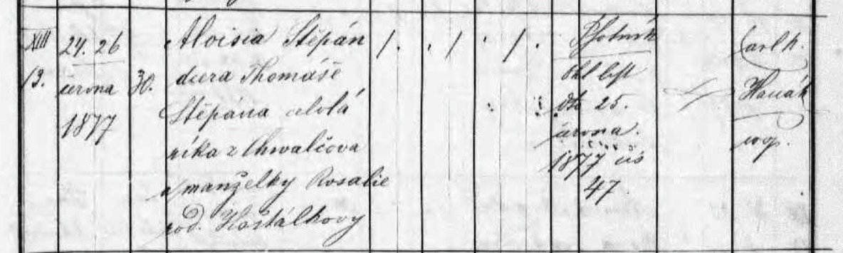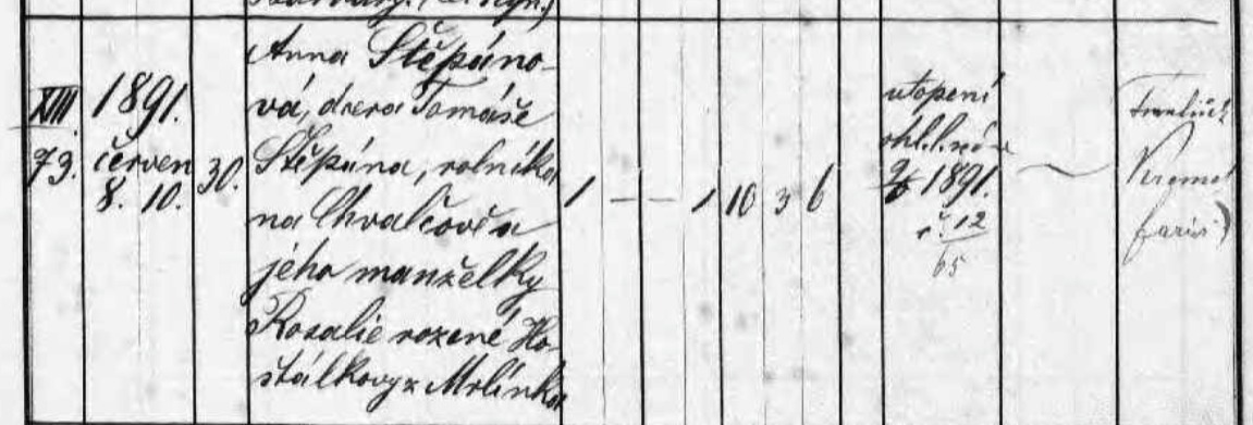 Matriční zápis o úmrtí Anežky Štěpánové, roz. Persunové a jejího syna Františka v roce 1896.