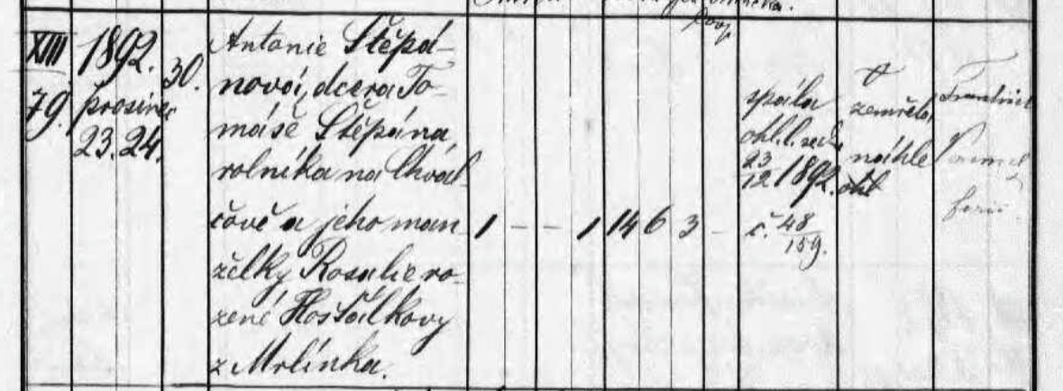 • Dcera Antonína (1894 – 1982) byla otcem dána na výchovu k tetě do Horního Újezda. Tam se Antonína později provdala za pana Kroupu a měla 8 dětí –  Františku Mikšánkovou (1923), Marii Kučerovou (1925), Boženu Masařovou (1926), Františka Kroupu (1927), Stanislava Kroupu (1937), Emila Kroupu (1929), Annu Koutná a Miroslava Kroupu (?)