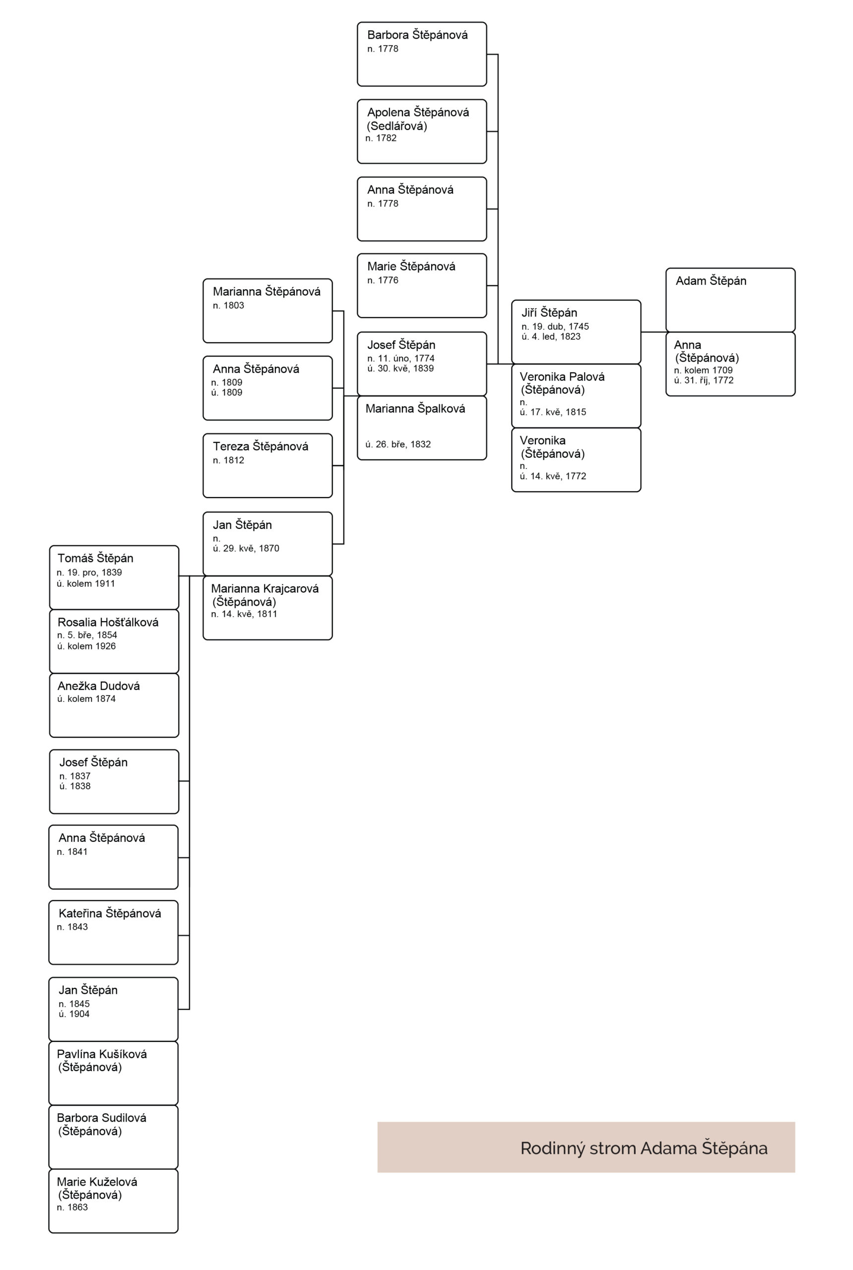 Adam Štěpán s Annou jsou rodiči Jiřího Štěpána, nar. 19. dubna 1745. Ten je již prokazatelně doložen na adrese Chvalčov 30, kde zemřel roku 1823. Se svou druhou ženou Veronikou, roz. Palovou (? – 1815), byl sezdán 8. června 1772 ve Chvalčově a 11. února 1774 se jim narodil syn Josef. Kromě Josefa měl Jiří Štěpán s Veronikou ještě další 4 dcery – Marii (1776), Annu (1778), Apolenu (1782) a Barboru (1785).
